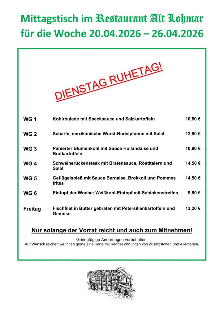 • Mi - Mo 11:30 Uhr - 14:00 Uhr - Küchenannahme bis 13:30 Uhr
